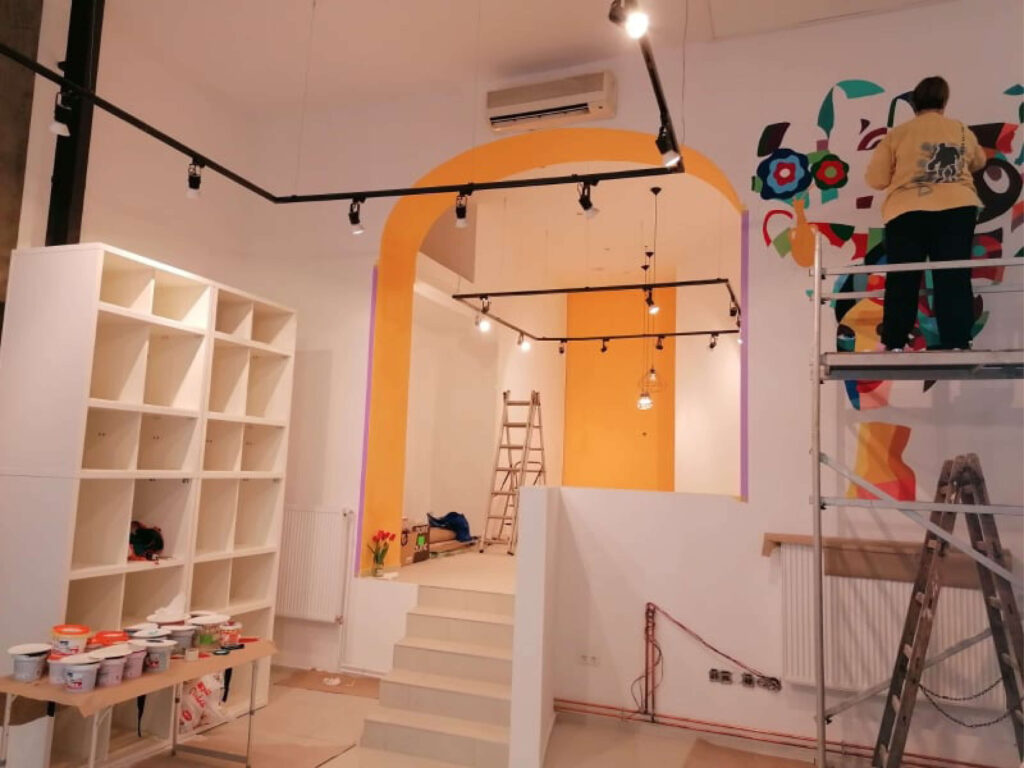 A falfestményt állványról, több szakaszban festettem meg, miközben a kompozíciót a helyhez igazítva át is alakítottam, hogy az eredeti street art lendülete harmonizáljon a bemutatóterem elegáns, letisztult világával.