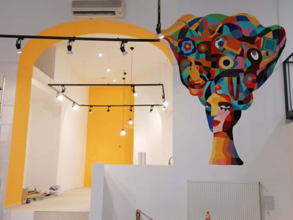 A tulajdonosnő talált rá az egyedi műre, és szerette volna, ha az inspiráló, energikus hangulat a showroom falán is életre kel. A MonM’art feladata az volt, hogy a művet adoptálja a térhez, figyelembe véve a fal arányait, a belsőépítészeti elemek ritmusát és a hely fényviszonyait.