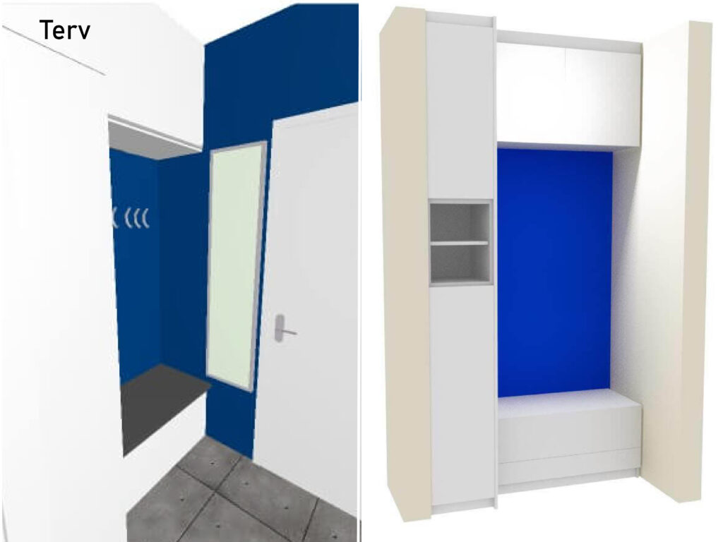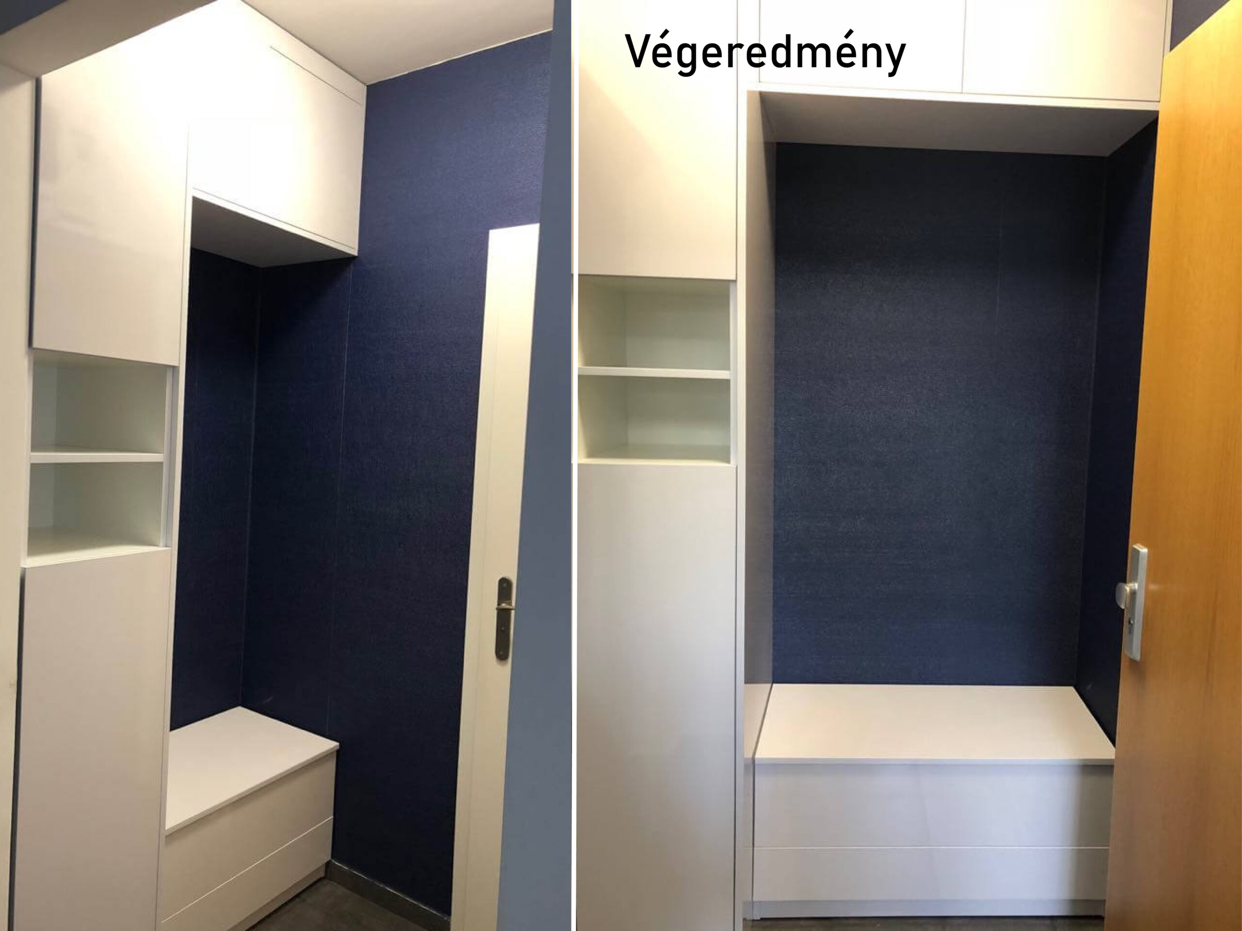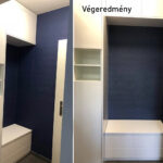 Az igények alapján megterveztem az előszobafal koncepcióját, amelyet az asztalos precízen kivitelezett. A tervezést egy kiugró falsík is nehezítette, ám ezt a szekrénybe integráltam, így egységes és harmonikus látvány született.