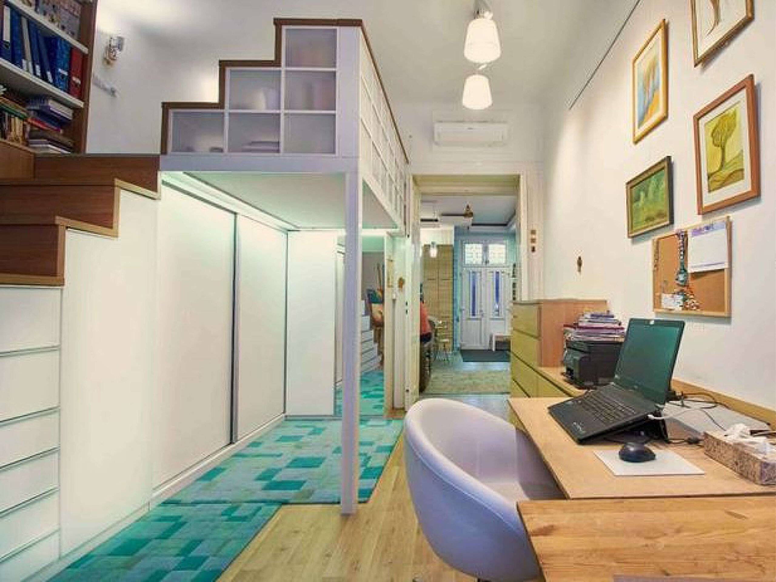 A sok holmi elhelyezésére a nagy belmagasság kínált kreatív megoldásokat: a wc és a kamra fölé magas tárolók, a nagyobb szobába pedig galéria került, amely mögött dupla szekrény – elöl akasztós, hátul polcos – ad helyet a ruháknak és tárgyaknak. A bútorokban mindenhol ötletes, rejtett tárolók segítik a rendezett életteret.