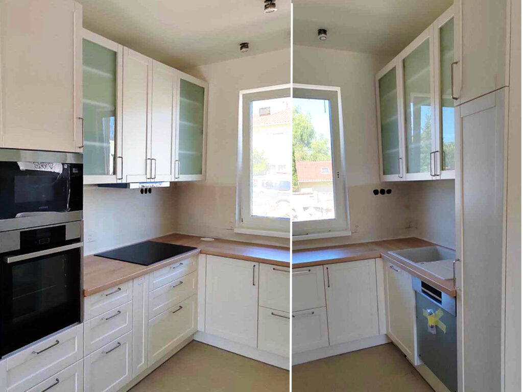 Az alapot azonos konyhabútorfrontok adták – így a ház két része vizuálisan is rokon maradt –, ám a tér elrendezése, a csempeválasztás és a részletek más-más karaktert kaptak.