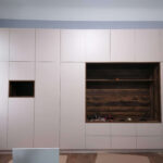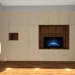 A nappaliban egy komplett, falra simuló beépített bútorrendszer készült, amely rejtett módon ad helyet a tárolásnak, miközben a szoba nappali jellege megmaradt. A tulajdonos kérésére sok vasalatos megoldás (például teleszkópos ruhalift) is beépítésre került.