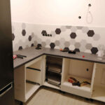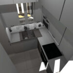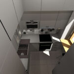 A konyha teljesen beépítésre került, a magas falak adta lehetőségeket kihasználva két sor felsőszekrényt terveztem, így minden funkció elfért a hely maximális kihasználása mellett. A tervezés során külön figyelmet kapott az ergonómia és a használhatóság, hogy a mindennapi konyhai tevékenységek kényelmesen elérhetők maradjanak.