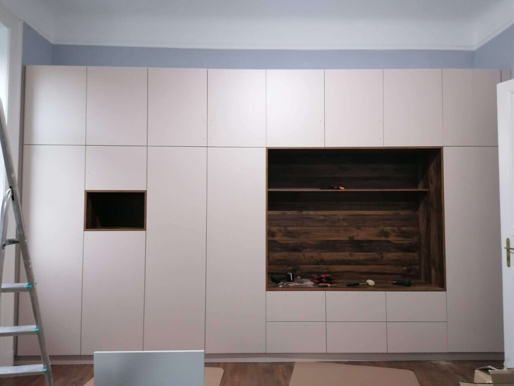 A nappaliban egy komplett, falra simuló beépített bútorrendszer készült, amely rejtett módon ad helyet a tárolásnak, miközben a szoba nappali jellege megmaradt. A tulajdonos kérésére sok vasalatos megoldás (például teleszkópos ruhalift) is beépítésre került.
