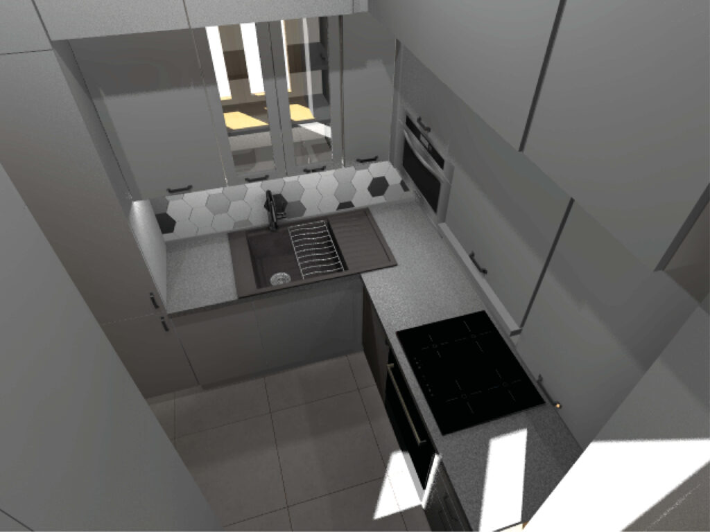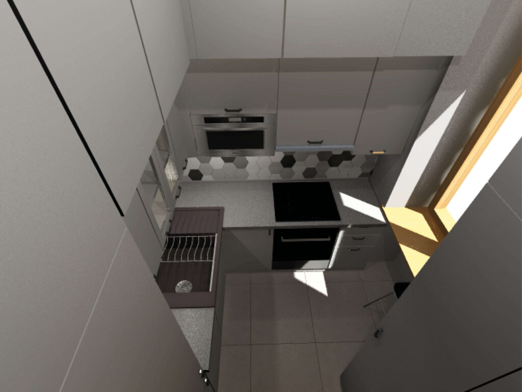 A konyha teljesen beépítésre került, a magas falak adta lehetőségeket kihasználva két sor felsőszekrényt terveztem, így minden funkció elfért a hely maximális kihasználása mellett. A tervezés során külön figyelmet kapott az ergonómia és a használhatóság, hogy a mindennapi konyhai tevékenységek kényelmesen elérhetők maradjanak.